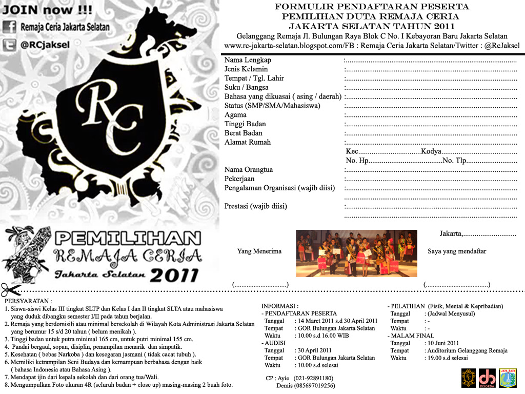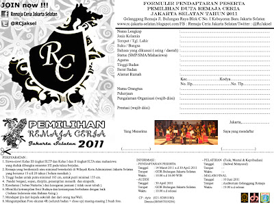Formulir bisa DONWLOAD dibawah dan dikembalikan SEBELUM TANGGAL 30 APRIL 2011 atau kamu bisa minta Formulir Pendaftaran dengan email ke endru_putra@yahoo.com
